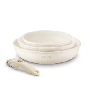 Odpinany uchwyt wykonany z kremowego tworzywa typu soft touch jest ergonomiczny, antypoślizgowy i nienagrzewający się, co zwiększa bezpieczeństwo użytkowania. Dzięki możliwości odłączenia uchwytu, patelnie można używać w piekarniku w temperaturze do 220°C, a także wygodnie przechowywać, oszczędzając miejsce w szafce kuchennej. Design patelni utrzymany jest w nowoczesnym, kremowym kolorze z matowym, nakrapianym wykończeniem, co nadaje zestawowi elegancji i stylu. Połączenie estetyki i funkcjonalności sprawia, że patelnie nie tylko doskonale sprawdzają się w przygotowywaniu potraw, ale również prezentują się atrakcyjnie na kuchennym blacie. Zestaw trzech patelni z odpinanym uchwytem to inwestycja w wygodę, trwałość i nowoczesny design.