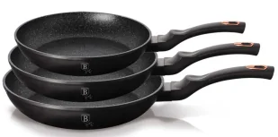 Zestaw zawiera: Patelnia Ø20 x 4. 0cm Patelnia Ø24 x 4. 5cm Patelnia Ø28 x 5cm Cechy naczyń: Potrójna powłoka granitowa anty-przywierająca Materiał:
