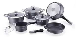 Zestaw garnków wysokiej jakości RL-ES1014M w kolorze szarym, to wyjątkowo interesująca propozycja firmy Royalty Line - zestaw garnków z powłoką marmurową, oraz nieprzywierającą powłoką greblonową. Jest to jedna z najlepszej jakości powłok nieprzywierających, gdyż jest wytrzymała, a przede wszystkim nie zawiera żadnych szkodliwych substancji typu kadm czy PFOA. Odmiana greblonu 3+ oznacza również, że można swobodnie używać tych garnków i patelni bez tłuszczu, a potrawy nie przyklejają się do dna. Dodatkowo w zestawie tym zostało zastosowane ciekawe rozwiązanie - w patelniach oraz w rondelku można odpinać rączki, co pozwala na estetyczne i ekonomiczne układanie garnków w szafce. Uchwyty garnków wykonane są z tego samego materiału co garnek, dzięki czemu garnki mogą być stosowane jako formy do zapiekanek czy też wykorzystywane do duszenia potraw w piekarniku.