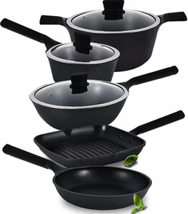 Wystarczy niewielka ilość tłuszczu, aby przygotować ulubione danie. Standardowe wymiary garnków będą pasować na każdą kuchenkę. ▶ W skład zestawu wchodzą: garnek 5,5 l, 5 l, 2 l patelnia 2,2 l patelnia grill 2,3 l ✔️ SPECYFIKACJA kolor: czarny opakowanie: