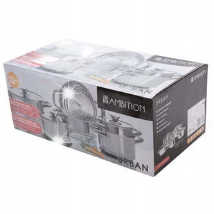 Komplet garnków kolekcji Urban. Garnki marki Ambition wykonane są z wysokiej jakości stali nierdzewnej z niezwykłą starannością i dbałością o każdy szczegół. Garnki w nowoczesnym i eleganckim kształcie połączonym z nietypowym wykończeniem gałki i szklaną pokrywą z odpowietrznikiem odprowadzającym nadmiar pary. Garnki posiadają grube dno 3-warstwowe (stal-aluminum-stal) zapewniające szybkie i równomierne nagrzewanie naczynia oraz grube ścianki, są łatwe do utrzymania w czystości, wygodne i praktyczne. Rączki ze stali nierdzewnej, skala na wewnętrznej ściance garnka.