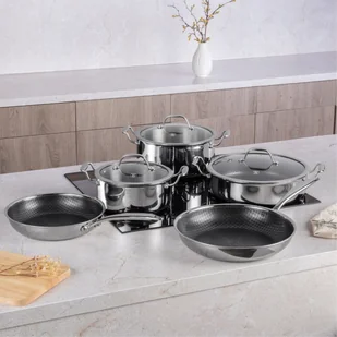 Zestaw garnków i patelni 8 el. BerlingerHaus Eternal Collection BH-8518 Wzbogać swoją kuchnię o 8-elementowy zestaw garnków i patelni Berlinger Haus z serii Eternal Collection, wykonany z trójwarstwowej stali nierdzewnej 18/10 i pokryty nowoczesną, niezwykle trwałą powłoką nieprzywierającą Whitford ETERNA. To połączenie elegancji, innowacji i funkcjonalności, idealne zarówno do codziennego gotowania, jak i dla pasjonatów kulinariów. Zestaw jest przystosowany do wszystkich typów kuchenek, w tym indukcyjnych, może być używany w piekarniku do 300°C, a jego odlewane uchwyty gwarantują stabilność i długowieczność. Zawartość zestawu Garnek niski z pokrywką Ø28 × 7,5 cm – 3,8 L Garnek z pokrywką Ø20 × 9,5 cm – 2,7 L Garnek z pokrywką Ø24 × 11,5 cm – 4,5 L Patelnia Ø24 × 5 cm – 1,7 L Patelnia Ø28 × 5,5 cm – 2,4 L Najważniejsze cechy: