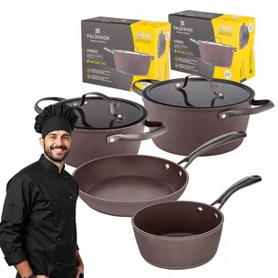 Dodatkowo trwała struktura powłoki gwarantuje długą żywotność bez obaw o uszkodzenia mechaniczne. Co więcej, powłoka PFLUON jest bezpieczna dla zdrowia, ponieważ nie zawiera szkodliwych substancji, takich jak PFOA, PFOS czy kadm, co czyni ją idealnym wyborem dla każdego, kto ceni jakość i bezpieczeństwo w swojej kuchni. Gotuj bez kompromisów – wybierz naczynia z powłoką PFLUON i ciesz się wyjątkowym komfortem gotowania! VALDINOX - MISTRZOWSKIE NACZYNIA W TWOJEJ KUCHNI Zestaw Valdinox Stripes to połączenie funkcjonalności, trwałości i elegancji – idealny do każdej kuchni! Styl i funkcjonalność w Twojej kuchni Odkryj kolekcję garnków i patelni Valdinox Stripes, która łączy elegancję z niezawodnością. Charakterystyczna, żebrowana powierzchnia w głębokim odcieniu brązu nadaje naczyniom wyjątkowy styl, który doskonale komponuje się z nowoczesnymi i klasycznymi wnętrzami. Naczynia wykonane są z wysokiej jakości materiałów, gwarantujących równomierne rozprowadzanie ciepła, a ich nieprzywierająca powłoka pozwala na zdrowe gotowanie bez nadmiaru tłuszczu.