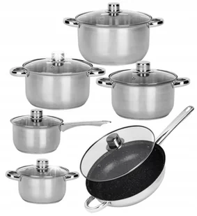 Zestaw garnków 12 elementów SREBRNE RĄCZKI Indukcja Gaz Marka: RONNER Austria KL71G Zestaw garnków wykonanych ze stali z pokrywkami w komplecie, składający się z 12 elementów. Garnki posiadają specjalne dno, które dobrze rozprowadza i utrzymuje ciepło, a gotowanie jest oszczędne i szybkie. Zestaw posiada garnki o optymalnej pojemności, najczęściej wykorzystywanej w kuchni. Zapewniają wygodę i możliwość dopasowania rozmiaru garnka do konkretnego dania.