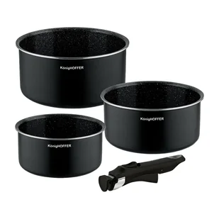 Komplet garnków KONIGHOFFER Spinel Black to idealny wybór do Twojej kuchni. Zestaw 3 garnków o średnicach 16, 18 i 20 cm wykonano z aluminium, które zapewnia energooszczędność i poręczność podczas codziennego gotowania. Dzięki specjalnej powłoce Marble Plus o wysokiej twardości i strukturze opracowanej z myślą o wieloletnim użytkowaniu, garnki doskonale nadają się do smażenia i gotowania różnorodnych potraw.