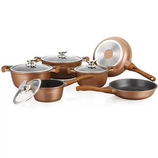 Zestaw garnków wysokiej jakości RL-BS1010 w kolorze miedzianym, to wyjątkowo interesująca propozycja marki Royalty Line - zestaw garnków z powłoką marmurową, oraz nieprzywierającą powłoką greblonową. Jest to jedna z najlepszej jakości powłok nieprzywierających, gdyż jest wytrzymała, a przede wszystkim nie zawiera żadnych szkodliwych substancji typu kadm czy PFOA. Odmiana greblonu 3+ oznacza również, że można swobodnie używać tych garnków i patelni bez tłuszczu, a potrawy nie przyklejają się do dna. Uchwyty garnków wykonane są z tego nienagrzewającego się materiału, który dodatkowo ma właściwości antypoślizgowe i ułatwia bezpieczne przenoszenie z miejsca na miejsce. Garnki i patelnie wykonane są bardzo starannie, podobnie jak pokrywki, które są bardzo dokładnie dopasowane do średnicy garnka, a w celu odprowadzania nadmiaru pary zastosowano otwór w pokrywie.
