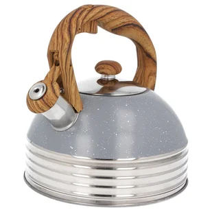 Czajnik BRUNBESTE BB-2477 2,5L — stylowy, szary marmurek z gwizdkiem i uchwytem drewnopodobnym. Kompatybilny z płytą indukcyjną, pojemny i solidny (waga brutto 2500 g). Idealny do codziennego użytku — szybkie gotowanie, łatwe nalewanie i elegancki wygląd w kuchni.