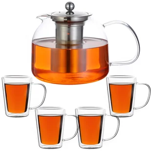 5-częściowy zestaw do herbaty składa się z czajnika 1,5 L z wyjmowanym sitkiem do herbaty ze stali nierdzewnej wraz z 4 szklankami do herbaty thermo 250ml. Czajniczek jak i szklanki do herbaty wykonane ze szkła borokrzemowego charakteryzują się wysoką odpornością termiczną. Szklany czajniczek wytrzymuje wahania temperatury od minus 30°C do plus 150°C. Bardzo drobne sitko ze stali nierdzewnej jest idealne do wszystkich rodzajów herbaty: torebek herbaty, herbaty kwiatowej, a nawet małych liści herbaty.