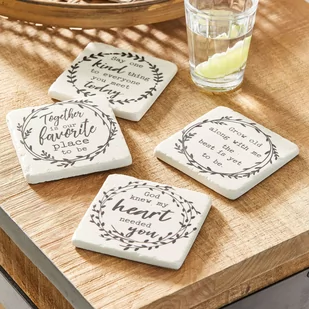 Cztery wysokiej jakości podstawki w zestawie. Solidny sztuczny kamień z korkowym spodem. Każda podstawka ozdobiona jest pięknym napisem. Niezależnie od tego, czy chcesz wypić poranną filiżankę kawy i dbasz o blat swojego stołu, czy podajesz gościom wyborne wino do kolacji – te podstawki sprawdzą się idealnie. Ten zgrabny zestaw wykonano ze sztucznego kamienia, a pod spód podłożono warstwę korkową.