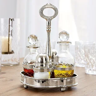 Czysty mosiądz z wykończeniem w kolorze antycznego srebra i szkło ze szlifem w romby. Stylowy dodatek do kuchni o antycznym wyglądzie, który tworzy wrażenie elegancji przy stole. Solniczka i pieprzniczka, buteleczki na ocet i oliwę stoją elegancko na posrebrzanej podstawce z praktycznym uchwytem do przenoszenia. Dwie szklane buteleczki tworzą czarujący akcent dzięki filigranowemu szlifowi w romby. Posrebrzane pokrywki wykonane z mosiądzu są gustownym zamknięciem solniczki i pieprzniczki.