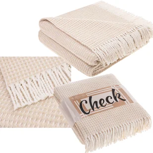 Bawełniano-akrylowy koc Check w kolorze beżowym to wysokiej jakości produkt, który będzie Ci z powodzeniem służyć zarówno jako użyteczna, ciepła narzuta oraz jako dekoracyjny pled. Wymiary koca 200x220 cm są idealne do okrycia się w chłodniejsze wieczory. Dzięki wykończeniu brzegów ozdobnymi frędzlami model ten świetnie zbuduje aranżację przytulnego wnętrza.