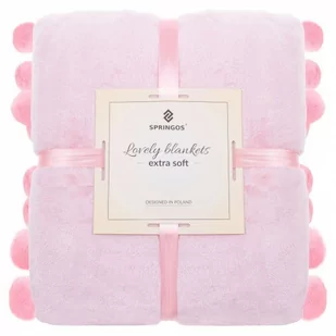 Narzuta na fotel, sofę 200x220 cm, dwustronny koc na łóżko jasny różowy Parametry: Materiał: poliester Kolor: jasny różowy Wymiary: 200 x 220 cm Średnica pompona: 3,5 cm Długość zwisających pomponów: