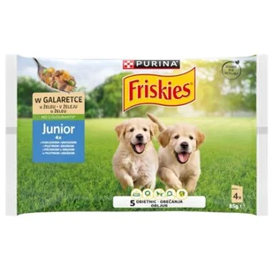 Karma dla psa FRISKIES Junior w galaretce z kurczakiem i groszkiem 4 x 85 g