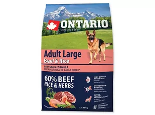 Ontario Large Adult Beef & Rice 2,25kg Pełnoporcjowa karma dla dorosłych psów ras dużych i olbrzymich (od 2 do 8 lat), hipoalergiczna formuła o niskiej zawartości zbóż. Zrównoważony skład dla zdrowego funkcjonowania całego organizmu. Szczególnie ważny dla zdrowia dużych ras układ mięśniowo-szkieletowy jest wspierany przez zawartą w karmie chondroitynę oraz olej rybny potrzebny do utrzymania wspaniałej mobilności i zdrowych stawów. Duża zawartość białka pochodzącego z mięsa wołowego, sprzyja prawidłowemu rozwojowi tkanki mięśniowej. Specjalna mieszanka ziół i przypraw, zwłaszcza tymianku, kopru włoskiego i juki pomaga w prawidłowym trawieniu.