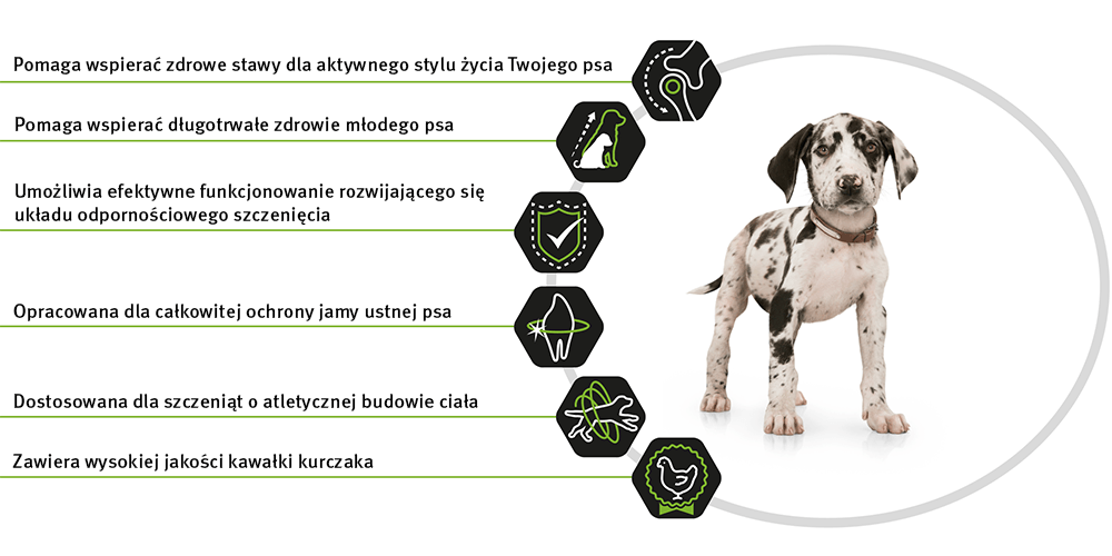 Sucha karma odpowiednia dla szczeniąt dużych ras o atletycznej budowie ciała. Karma ta została opracowana przez lekarzy weterynarii i dietetyków, by zadbać o prawidłowy rozwój psów w 2 pierwszych latach życia. Purina PRO PLAN z OPTISTART pomaga wzmocnić naturalną odporność szczeniąt poprzez zastosowanie siary, czyli pierwszego mleka matki, bogatego w naturalne przeciwciała. Kompozycja składników odżywczych zawartych w karmie wspiera prawidłowy rozwój stawów u młodych psów, wspomagając jednocześnie ochronę jamy ustnej.