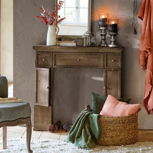 Ta oryginalna konsola kominkowa z naturalnego drewna urzeka starannym wykonaniem, kreatywnym designem i najwyższą funkcjonalnością. Jest nie tylko dekoracyjna, ale także niezwykle praktyczna – posiada trzy ukryte szuflady, a także półki schowane za dwojgiem drzwiczek. Oferuje więc wystarczająco dużo miejsca na wszystkie Twoje rzeczy i wnosi do wnętrza ciepłą, romantyczną atmosferę. To niezbędny dodatek dla wszystkich miłośników klasycznych aranżacji!