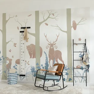 Stwórz fantastyczny pokój dziecięcy z tą modną fototapetą zwierzęta leśne w kolorze niebieski,beżIkolor piaskowy. Tapeta tworzy przytulną atmosferę i można ją ładnie łączyć z jasnymi kolorami i naturalnymi materiałami.