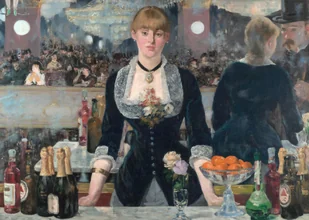 Ten niezwykły plakat stanowi wierną reprodukcję ostatniego arcydzieła Édouarda Maneta - "A Bar at the Folies-Bergère" z 1882 roku. Dzieło powstało zaledwie rok przed śmiercią mistrza impresjonizmu w jego paryskiej pracowni, gdzie artysta pracował z modelką - prawdziwą barmanką z kabaretu Folies-Bergère. Fascynujące jest to, że Manet, już ciężko chory, zrekonstruował fragment słynnego lokalu we własnym atelier, by uchwycić autentyczną atmosferę tego miejsca. Kolorystyka dzieła zbudowana jest na kontrastach - dominują głębokie ultramaryny i pruska zieleń w strojach postaci, przełamywane ciepłymi akcentami w postaci pomarańczowych owoców i złocistych refleksów butelek. Barwy ziemi mieszają się z chłodnymi srebrzystymi tonami lustra, tworząc niepowtarzalną paletę barwną charakterystyczną dla nocnych lokali tamtej epoki.