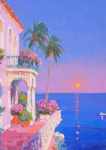 Piękny plakat przedstawiający luksusowy nadmorski pejzaż z balkonem ozdobionego kwiatami. Obraz namalowany w jasnych, żywych kolorach oddaje letni, wakacyjny klimat. Idealna dekoracja wnętrz w stylu śródziemnomorskim lub egzotycznym. Na tym oszałamiającym plakacie uwieczniono luksusowy pejzaż z balkonem, na którym można podziwiać zapierający dech w piersiach widok na lazurowe morze. Obraz, naszkicowany pędzlem artysty, przenosi nas w świat letnich, niemal bajkowych wakacji.