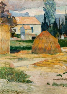 **Paul Gauguin - Pejzaż wiejski z chatami i stogiem** Ten fascynujący plakat będący reprintem dzieła Paula Gauguina przenosi nas w świat postimpresjonistycznej wizji francuskiej prowincji. Gauguin, malarz-wizjoner, który porzucił bankierską karierę dla sztuki, tworzył w latach osiemdziesiątych XIX wieku obrazy pełne emocjonalnej głębi i rewolucyjnej kolorystyki. Artysta, znany przede wszystkim z tahitańskich płócien, w swoim wcześniejszym okresie penetrował też uroki bretońskiego krajobrazu, gdzie eksperymentował z syntezą form i odważnymi zestawieniami barwnymi. Kompozycja zachwyca harmonijną grą ciepłych tonów - od miodowego złota stogów siana, przez umbrowożółte dachy chat, po soczystą zieleń traw i drzew. Charakterystyczna dla Gauguina paleta łączy ochry, sepie i kadmową żółć z odcieniami zieleni chromowej i błękitów kobaltowych w tle.