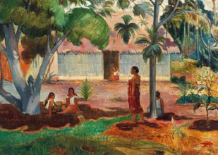 Ten wyjątkowy plakat przedstawia reprintem jednego z najsłynniejszych dzieł Paula Gauguina z tahitiańskiego okresu twórczości - "Te raau nahie" (Miłe kwiaty), namalowanego w 1896 roku podczas drugiego pobytu artysty na Tahiti. Gauguin, poszukując pierwotnej czystości i uciekając od cywilizacyjnego znużenia Europy, stworzył na wyspach Polinezji Francuskiej swoje najbardziej rozpoznawalne arcydzieła, będące syntezą zachodnich technik malarskich z egzotyczną atmosferą Pacyfiku. Kompozycja urzeka harmonijnym połączeniem soczystej zieleni palm kokosowych z ciepłymi, ochrowo-pomarańczowymi tonami ziemi. Dominują tu kolory ziemi - od cynobru po umbry palone, przeplatane kadmową zielenią tropikalnej roślinności i delikatnymi akcentami kobaltowej błękiti. W centralnej części kompozycji widzimy postacie tahitańskich kobiet w tradycyjnych strojach, otoczone bujną tropikalną florą i charakterystyczną architekturą wyspy.