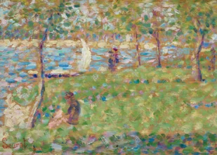 Ten wyjątkowy plakat przedstawia reprintem dzieła Georges'a Seurata, mistrza francuskiego pointylizmu z końca XIX wieku. Seurat, twórca rewolucyjnej techniki dzielenia barw, zasłynął przede wszystkim swoim monumentalnym płótnem "Niedzielne popołudnie na wyspie Grande Jatte", jednak jego mniejsze studia krajobrazowe równie fascynująco odkrywają tajniki neoimpresjonistycznej wizji. Kompozycja urzeka delikatną harmonią barw ziemi przeplatanych z błękitnymi refleksami wody. Dominują tu oliwkowe zielenie trawy, miodowe tony słońca przebijającego przez listowie oraz subtelne ultramaryny wodnej tafli. Charakterystyczne dla Seurata drobne, rytmiczne pociągnięcia pędzla tworzą wibrującą mozaikę kolorów, która zdaje się drżeć w popołudniowym świetle.