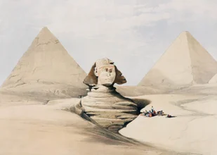 Majestatyczny Sfinks i Piramidy w Gizie - plakat przedstawiający dzieło z cyklu "David Roberts - Nil, Egipt i Nubia (1846-1849)" przenosi nas w podróż do tajemniczej krainy faraonów. Ta niezwykła litografia powstała podczas słynnej ekspedycji szkockiego malarza Davida Robertsa, który w latach 40. XIX wieku przemierzył Bliski Wschód, dokumentując zabytki starożytności. Roberts, uznawany za jednego z najwybitniejszych orientalistów swojej epoki, stworzył serię ilustracji, które do dziś zachwycają precyzją wykonania i romantyczną wizją Orientu. Kolorystyka plakatu utrzymana jest w ciepłych, piaskowych tonach - dominują beże, ugry i delikatne brązy, które idealnie oddają pustynny klimat egipskiego krajobrazu.