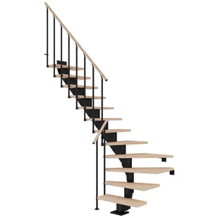 Schody modułowe z zabiegiem 1/4, na konstrukcji metalowej, malowanej proszkowo na kolor czarny (RAL9005), ze stopniami o szerokości 75 cm, wykonanymi z wysokiej jakości drewna dębowego, olejowanego. Schody dostępne są w czterech wariantach: 11 stopni (do wysokości kondygnacji 222 - 258 cm), 12 stopni (do wysokości kondygnacji 240.5 - 279.5 cm), 13 stopni (do wysokości kondygnacji 259 - 301 cm) i 14 stopni (do wysokości kondygnacji 277.5 - 322.5 cm). Każdy stopień posiada regulowaną wysokość od 18,5 – 21,5 cm. Schody posiadają maskownice, dzięki którym śruby montażowe są niewidoczne.