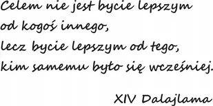 Przedmiotem sprzedaży jest naklejka ścienna z folii matowej, wycięta po obrysie, nie posiadająca tła: Napis na ścianę, naklejka - Dalajlama - 118 Cena Kup Teraz dotyczy arkusza z rozmiarze: 150 cm x 75 cm Naklejki na ścianę w formie napisu czy cytatu są obecnie jedną z najpopularniejszych form dekoracji wnętrz. Dobrze dobrany napis na ścianę, czy cytat ulubionego autora w formie naklejki, potrafi odmienić wnętrze w parę chwil. Szeroka paleta kolorów i rozmiarów zapewni Państwu możliwość dopasowania jej do każdego wnętrza.