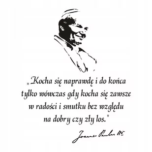 Przedmiotem sprzedaży jest naklejka ścienna z folii matowej, wycięta po obrysie, nie posiadająca tła: Napis na ścianę naklejka Papież Jan Paweł II - 265 Cena Kup Teraz dotyczy arkusza o rozmiarze: wys. 144 cm x szer. 120 cm O naszych naklejkach: Wykonane są one z wytrzymałej, wysokojakościowej, samoprzylepnej matowej folii winylowej.