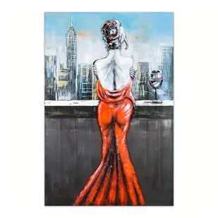 Obraz metalowy 3D loft KOBIETA W CZERWIENI metalowy obraz 3D wykonany z recyklingowej stali realne wypukłości kolorystyka uzyskana za pomocą farb lub naturalnych przebarwień i korozji impregnacja bezbarwnym lakierem gwarantuje zachowanie barw oraz odporność na zarysowania obraz przedstawia kobietę w czerwonej sukience podziwiającą panoramę miasta Przestrzenne, loftowe dekoracje wykonane na zasadach manufaktury nie pozwalają przejść obok siebie obojętnie. Prezentowany obraz 3D został wykonany z recyklingowej stali, a do wybarwienia obrazu, oprócz tradycyjnych farb, wykorzystano naturalne przebarwienia charakterystyczne dla zastosowanego surowca. Czerwona sukienka kontrastuje z odcieniami szarości i czerni, które dominują w tle, co dodaje obrazowi wyjątkowego uroku i elegancji. W tle widać wieżowce i panoramę miasta, co dodaje mu nowoczesnego klimatu. Ten niezwykły obraz 3D będzie doskonałym dodatkiem do każdego wnętrza, w szczególności dla miłośników nowoczesnego designu.