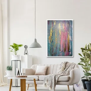Rozmiar 70 x 100 Delikatne pastelowe zestawienie kolorów różowego, złota, bieli i niebieskiego. Ciekawa struktura obrazu przypominająca postarzałą powierzchnię zamalowanego drewna. Obraz wykonany technik ...