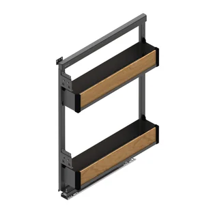 kosze z wysokiej jakości stali w kolorze czarnym matowym lub białym, system jezdny lewy lub prawy w zestawie, do szafki o szerokości 150 mm oraz 200 mm, dopuszczalne obciążenie całego systemu do 12 kg, możliwość regulacji wysokości zawieszenia koszy