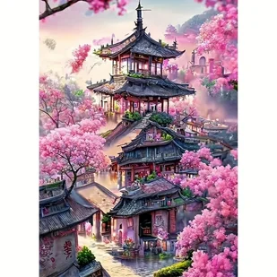 TEMU Zestaw do malowania diamentów 5D - Cudowna starożytne pagoda z kwiatami wiśni, okrągłe akrylowe diamenty, 11.8"x15.75" DIY Craft, Stitch Wall