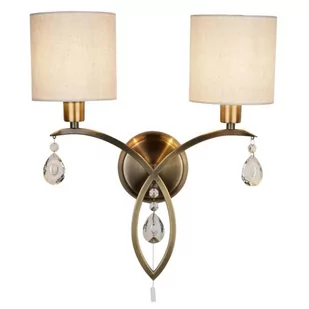 Kinkiet 2 punktowy z materiałowymi kremowymi abażurami. Elementy metalowe wykończone w kolorze antycznego mosiądzu. Przyozdobiona zwisającymi kryształowymi detalami. Wyłącznik sznurkowy. Poprzez lekkie pociągnięcie sznurka w szybki i wygodny sposób włączysz i wyłączysz światło.