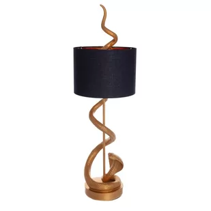Lampa stołowa z oryginalną podstawą, przedstawiająca złotą kobrę i czarnym kloszem. Dodatek do salonu lub gabinetu, który z pewnością przykuje uwagę domowników i gości! Niezwykle efektowna lampa, której podstawa przedstawia węża kobrę. Nad rzeźbą w kolorze złota, znajduje się czarny, materiałowy klosz, tworząc eleganckie, kolorystyczne zestawienie. Staranne wykonanie i szczegółowo odwzorowane detale przypadną do gustu miłośnikom oryginalnych dekoracji. Lampa kobra pięknie zaprezentuję się umieszczona na komodzie czy biurku.