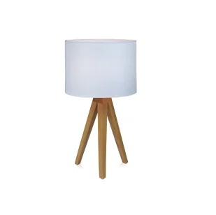 Drewniana lampa stołowa Kullen z białym abażurem na trójnogu