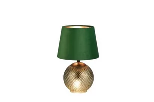 Lampa stołowa 1 punktowa z aksamitnym abażurem w kolorze zielonym (od spodu złotym). Szklana podstawa w kolorze zielonym. Lampa posiada włącznik umiejscowiony na przewodzie zasilającym.