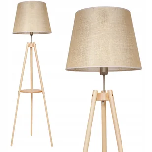 Jesteśmy producentem - kupując u nas masz pewność że kupujesz oryginalny produkt.Drewniana stojąca lampa podłogowa trójnóg z półką oraz jutowym abażurem w stylu boso