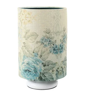Nocna lampa stołowa BLUEROSE-D-W z włącznikiem nożnym Lampa stołowa BLUEROSE-D-W to propozycja skierowana do osób szukających niedużej lampki, która zapewni nam dodatkowe źródło światła w salonie, w sypialni lub w biurze. Abażur lampy w kształcie tuby wykonany jest z tkaniny strukturalnej posiadającej kolorowy nadruk w niebieskie róże. Wnętrze lampy jest z PCV o zielonej barwie. Zastosowana tkanina wyróżnia się dużą odpornością na promieniowanie UV, dzięki czemu materiał nie odbarwia się nawet po wielu latach użytkowania. Podstawa lampki zrobiona jest z metalu o białej barwie.