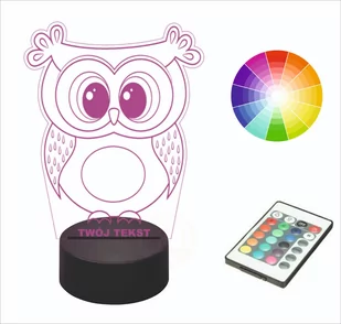 PERSONALIZOWANA LAMPKA NOCNA Z IMIENIEM SOWA SÓWKA Ciemność jest prawdopodobnie największym problemem przez który nasze pociechy nie chcą zasypiać w swoim pokoju lub w środku nocy przychodzą do rodziców. Teraz możesz to zmienić dzięki naszej lampce nocnej z ulubionym bohaterem swojego dziecka! Nasza personalizowana lampka rozświetli pokój w nocy dzięki czemu dziecko poczuje się bezpieczniej, a dodatkowym atutem będzie wybór ulubionego koloru, ulubiony bohater oraz imię dziecka wygrawerowane na lampce! Lampka posłuży również w dzień jako dekoracja pokoju. Świetnie nada się jako prezent na urodziny, święta lub inną okazję. PO ZAKUPIE KONIECZNIE PODAJ IMIĘ DZIECKA NIE PODANIE IMIENIA MOŻE WYDŁUŻYĆ REALIZACJĘ!!! OPIS PRODUKTU: Element podświetlany wykonany jest z wysokiej jakości nietłukącej się płyty akrylowej, podstawka z ABS.