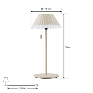 Akumulatorowa lampa stołowa LED Ilvi w beżowej kolorystyce z praktyczną funkcją CCT Odkryj akumulatorową lampę stołową LED Ilvi, która zachwyca nie tylko stylową beżową kolorystyką i wysokiej jakości aluminiową konstrukcją, ale także regulowaną barwą światła (CCT), która umożliwia dowolną zmianę barwy światła. Funkcja CCT jest sterowana za pomocą przełącznika pociągowego: naciśnij przełącznik raz, aby zapalić światło w kolorze ciepłej bieli (3000K), pociągnij go dwa razy, aby zapalić je w uniwersalnej bieli (4000K), a użyj przełącznika trzy razy, aby wyłączyć światło. Dzięki stopniowi ochrony IP54, lampa ta jest wystarczająco wytrzymała do użytku w różnych środowiskach, jednocześnie wnosząc nowoczesną i skandynawską estetykę do salonów i jadalni. Dane techniczne - bateria 3.