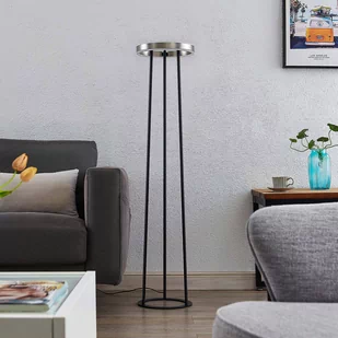 Lampa stojąca LED Seppe w kolorze niklu o nowoczesnym designie z aluminium i żelaza Lampa stojąca LED Seppe to idealny towarzysz, jeśli chodzi o oświetlenie akcentujące w salonie. Jest dostępna w atrakcyjnym połączeniu kolorów czarnego i niklowego, a jej obudowa składa się z okrągłej podstawy, z której wyrastają trzy wsporniki podtrzymujące klosz w kształcie pierścienia. Wewnątrz tego pierścienia znajduje się zainstalowany na stałe moduł LED, który może być ściemniany. Światło można włączać i wyłączać za pomocą przełącznika dotykowego. Dzięki technologii 3-stopniowego ściemniania ze zintegrowaną funkcją wyłączania, można ją również ściemniać do trzech różnych poziomów jasności poprzez kilkukrotne naciśnięcie przełącznika: