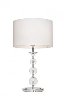 Lampa stołowa z tkaninowym kloszem w kolorze białym oraz korpusem wykonanym ze szklanych kul. Elementy metalowe wykończone w chromie.