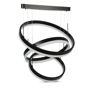 Lampa dekoracyjna zwieszana 92W V-TAC Soft LED Ring VT-82-3-B to lampa dekoracyjna LED o mocy 92W. W skład kompletu wchodzą trzy pierścienie o średnicy O60, O50 i O40 cm. Zewnętrzna obwódka wykonana jest z malowanego na czarno aluminium, klosz natomiast wykonany jest z mlecznego akrylu. Płynna regulacja położenia obręczy umożliwia dowolną konfigurację ustawienia wszystkich pierścieni lampy. W zestawie dołączone są stalowe linki montażowe, rozeta na sufit z ukrytymi zasilaczami, kołki rozporowe i śruby.
