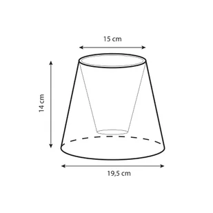 Abażur w kształcie stożka o wymiarach wysokość - 14 cm, szerokość - 15 cm (górna średnica), 19,5 cm (dolna średnica) wykonany ręcznie z holenderskiej tkaniny tekstylnej usztywnionej laminatem. Wykończony materiałową obwódką w tym samym kolorze. Druciany szkielet abażuru wykonany jest z metalu i proszkowo malowany na kolor biały. Klosz przeznaczony jest do kinkietów i lamp stołowych, które posiadają mocowanie na oprawę E27 (duży gwint). Dostępna kolorystyka abażurów: