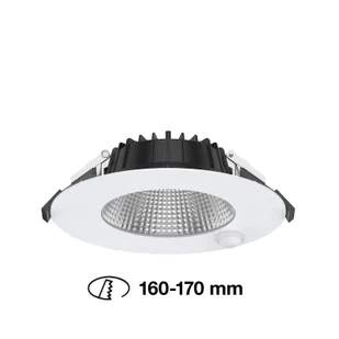 Downlight może być instalowany w wycięciach sufitowych o średnicy od 16 do 17 cm, dzięki czemu idealnie nadaje się nie tylko do nowych instalacji, ale także do wymiany istniejących opraw wpuszczanych - Dostarczany bez sterownika LED, który należy zamówić osobno - Stopień ochrony IP54 - Nadaje się również do innych średnic instalacji z pierścieniem przedłużającym dostępnym jako akcesorium - Może być również montowany na suficie za pomocą pasującej ramki montażowej (akcesorium) Dane czujnika ruchu: