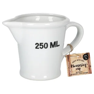 Ten klasyczny, solidny biały porcelanowy dzbanek z miarką przyciąga wzrok w kuchni. Ten prosty, ale nowoczesny design z prostą funkcjonalnością oferuje świetny dzbanek z miarką do codziennego gotowania lub pieczenia. Niezależnie od tego, czy chcesz odmierzyć wodę, mleko czy olej, dzięki podziałce co 50 ml odmierzanie jest dziecinnie proste. Zakres dostawy: 1 biały porcelanowy dzbanek z miarką 250 ml, (wys. x głęb.) 10,5 x 9,5 cm, Ø podstawy 7,3 cm, rozmiar uchwytu (wys. x szer.) 5,5 x 3,4 cm, 0,31 kg