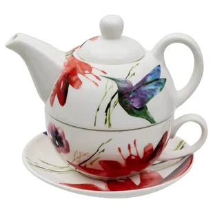 Empik Gifts Zestaw do herbaty „Kolorowy Lot” Wyjątkowy zestaw do herbaty „Kolorowy Lot” to harmonijne połączenie funkcjonalności i artystycznego piękna. Wykonany z najwyższej jakości porcelany, zachwyca lekkością formy oraz delikatnym, akwarelowym zdobieniem inspirowanym naturą. Barwne kolibry i kwiaty w odcieniach zieleni, błękitu, czerwieni i fioletu tworzą niepowtarzalną kompozycję, która wnosi do codziennych chwil spokoju odrobinę magii i barw. Zestaw składa się z eleganckiego dzbanka (400 ml), filiżanki (300 ml) i spodka — idealnych na popołudniową herbatę w pojedynkę. Dzięki starannemu wyprofilowaniu i złoconym detalom, każdy element doskonale leży w dłoni i zachowuje ciepło naparu przez dłuższy czas.