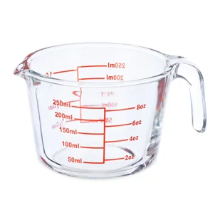 Mały szklany dzbanek z miarką jest idealnym narzędziem w kuchni do precyzyjnego odmierzania składników podczas gotowania i pieczenia. Oprócz klasycznej skali mililitrowej, dzbanek posiada również 2 łatwe do odczytania międzynarodowe skale pomiarowe w oz i filiżankach. Wykonany z odpornego na wysokie temperatury szkła borokrzemowego, dzbanek może być w kuchence mikrofalowej, piekarniku lub na płycie grzewczej. Mały uchwyt i niekapiący dziobek ułatwiają opróżnianie dzbanka. Dzbanek z miarkąw szczegółach- Wymiary wys.